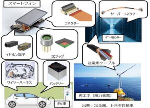 銅の最大の特徴は、銀に次ぐ導電性の高さだ。さらに、よく延びる「延性」と薄く広がる「展性」を兼ね備え、加工がしやすい。こうした優れた特性を持つ銅は、例えば電力分野では送電線や屋内配線に、通信分野ではケーブルに、電子機器では半導体のリードフレームなどに多用されている。エアコンや冷蔵庫の熱交換器にも熱伝導性の高さから使われている。地球温暖化防止の観点では、電気自動車や風力発電のモーターやリチウムイオン電池などにも欠かせない。自動車1台あたりの銅の使用量は、電気自動車では83kgと、ガソリン車(23kg)の3.6倍。ハイブリッド車でも40kgで、ガソリン車の1.7倍になるという。