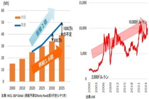 銅は、アルミニウムや亜鉛などと並んで埋蔵量や産出量が多い非鉄金属だが、将来、需要が供給を大きく上回る可能性がある。ある予測では、2035年時点の銅の需要量は2020年の2倍に達する一方で、供給量は1.6倍にとどまり、年間1000万トンの不足が生じると見込まれている。また、近年、銅の価格は右肩上がりの傾向だ。需給が逼迫し、価格も高まれば、データセンターの設置や電動車の普及、再生可能エネルギー導入のための送電線設置などに支障が生じ、GX(グリーントランスフォーメーション)やDX(デジタルトランスフォーメーション)の進展に影響が出る可能性がある。