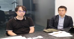 住友金属鉱山の銅事業を説明する経営企画部管理グループリーダーの渡辺さん(右)と金属事業本部事業室技術グループマネージャーの小林純一さん