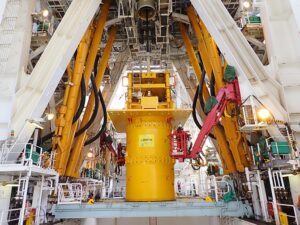 SIP海洋では、南鳥島沖水深6,000mの深海におけるレアアース資源の生産技術開発を目的として研究開発を進め、その当初から「ちきゅう」の既存設備及び能力を最大限活用することを前提とした採鉱システムの開発を目標としました。2020年には「ちきゅう」で吊下げ可能な6,000mの揚泥管(ライザー)の基本設計を完了し、揚泥管の製作にはコロナ禍の影響で遅延が生じたもの、2021年8月に今回の試験に向けた3,000m分の揚泥管が納入されました。同年9月には「ちきゅう」船上に操作機器を設置し、新規導入の揚泥管の接続試験を行いました。2022年5月には水深6,000m仕様の採鉱装置(図3)が完成し、同年6月に揚泥管及び採鉱装置と「ちきゅう」既存設備を一体化した採鉱システムの作動確認を駿河湾において行いました。(図4