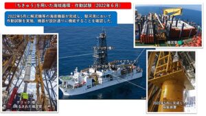 実海域試験は、茨城沖水深2,470mの海域で2022年8月12日から9月2日にかけて、海底3か所の採鉱サイトにおいて上記の作業を実施し、1日あたりに換算して約70トンの堆積物の回収に成功しました。この深度での海底堆積物の揚泥は世界でも初めてのケースであり、開発した技術は、JAMSTEC及び開発に参加した企業とともに7件の特許申請を行なっております。