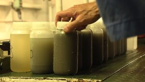 今回の技術開発システムは、環境負荷を極力小さくする閉鎖系二重管揚泥方式(※5)を採用し、その上で「解泥」「集泥」「揚泥」を可能とする採鉱装置を一体化した新たな採鉱システムです。具体的には、採鉱装置(解泥機)を海底に差し込む(図5)ことで海底のレアアース泥を採鉱装置に閉じ込めます。固く締まったレアアース泥は採鉱装置内の攪拌装置で攪拌され、海水と混ぜられることで懸濁液(スラリー化・液体化)(図6)となり揚泥管へと移送されます。その後は「ちきゅう」のライザー循環機能を活かし、揚泥菅内を垂直に循環する循環流を発生させ、この流れに沿う形で、レアアース泥を採鉱装置内から船上まで引き上げます。